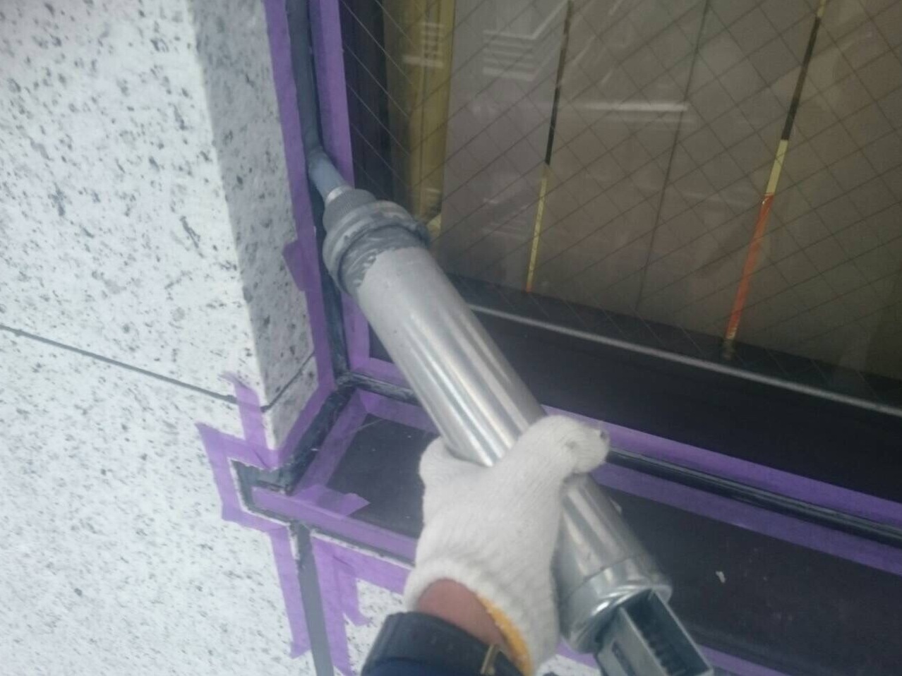 確認された補修箇所の工事後、ピンネットと呼ばれるネットを外壁全体に貼り、アンカーピンで留めていきます。